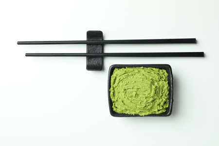 Chopsticks and wasabi sauce on white background