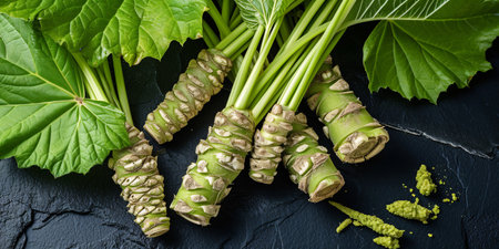 Vibrant display of fresh horseradish root and wasabi powder on a bamboo mat. This arrangement showcases essential ingredients for authentic Japanese cuisine.
