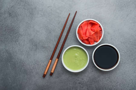 Hot wasabi paste, soy sauce and ginger on grey textured table, closeup