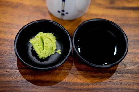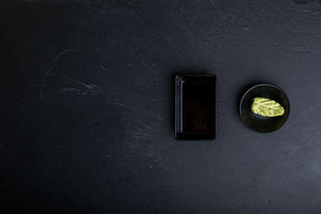 Soy sauce and wasabi sauce for sushi in black bowl. Top view.