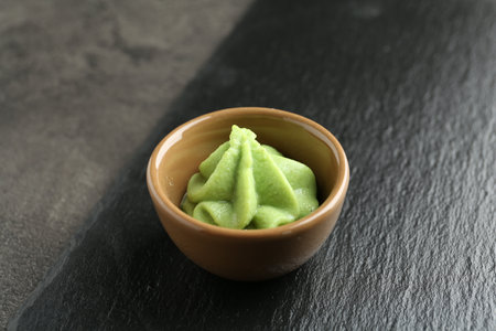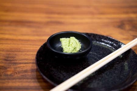 Wasabi in black saucer on wooden table with depth of field effect, Japanese food's condiment, bokeh background