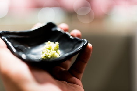 Wasabi paste in black bowl on hand. A close up shot of a small bowl with green wasabi paste.