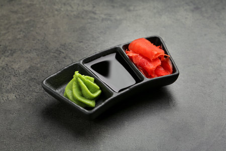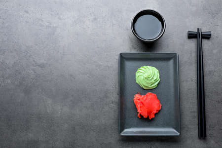 Hot wasabi paste, soy sauce and ginger on black textured table, closeup