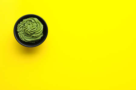 Bowl with swirl of wasabi paste on yellow background, top view. Space for text