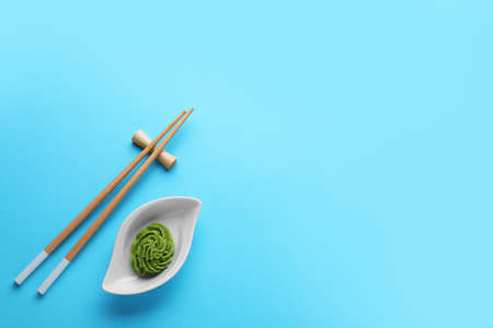 Bowl with swirl of wasabi paste and chopsticks on light blue background, flat lay. Space for text