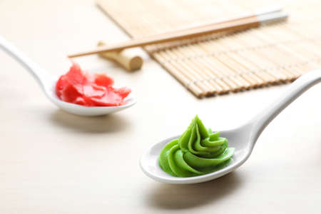 Spoons with swirl of wasabi paste and pickled ginger on white table, closeup