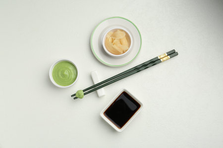 Hot wasabi paste, ginger, soy sauce and chopsticks on light textured table, flat lay