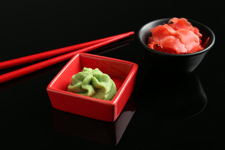 Hot wasabi paste, ginger and chopsticks on black mirror surface, closeup