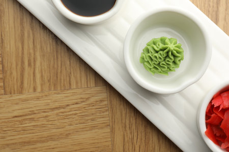 Hot wasabi paste, soy sauce and ginger on wooden table, top view