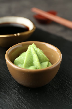 Hot wasabi paste and soy sauce on dark table, closeup