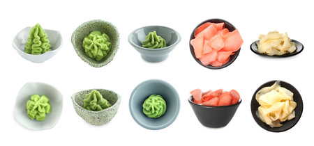 Wasabi and pickled ginger isolated on white, collage. Top and side views