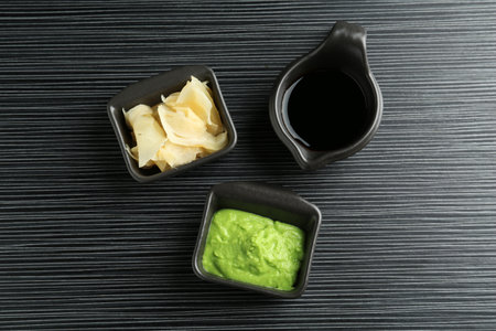 Hot wasabi paste, soy sauce and ginger on black textured table, flat lay