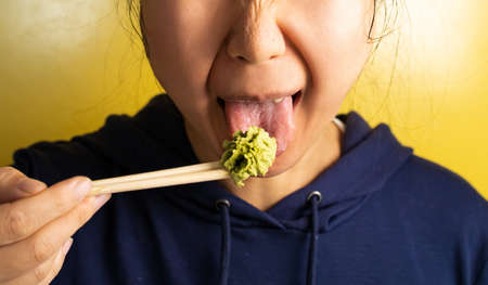 Funny young asian woman holding spicy wasabi show tongue