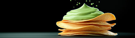 This image showcases an enticing stack of tortilla chips topped with smooth avocado dip against a dark background. Perfect for food enthusiasts!