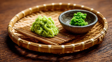 A vibrant wasabi preparation on a bamboo mat accompanied by a dish of condiments, highlighting the freshness and artful presentation ideal for culinary exploration.