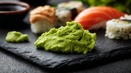 Vibrant wasabi paste sits elegantly beside assorted sushi and sashimi on a stylish slate platter, creating a perfect complement for a delightful Japanese dining experience.