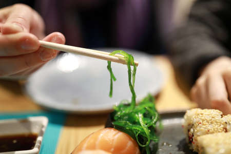 Person eating chukka seaweed with chopsticks in asian restaurant