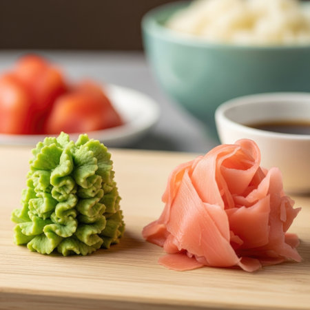 A close-up captures a vibrant green wasabi and delicate pink ginger on a wooden surface. Soft lighting illuminates the textures and colors of the food. In the blurred background, there are other food items arranged in bowls, creating a culinary composition suitable for editorial or commercial applications.