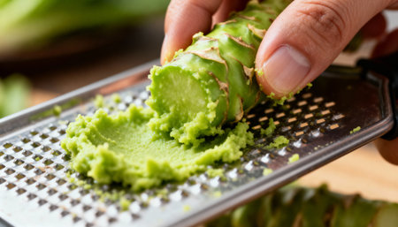 Fresh wasabi root being grated to create a spicy green paste, highlighting traditional Japanese cuisine and culinary preparation.