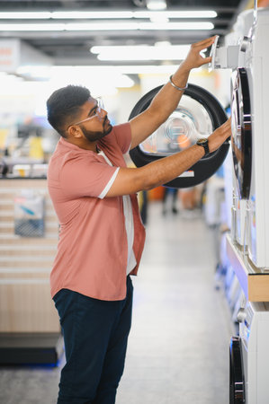 African American man crouching down, examining a washing machine while shopping in an appliance store, comparing options for home needs