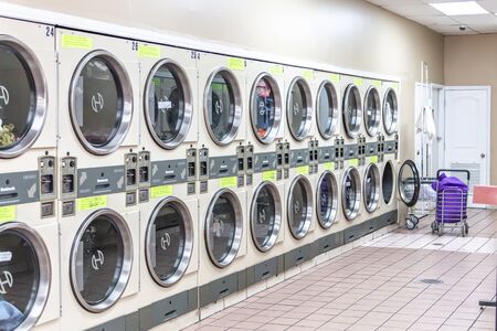 Miami, USA - September 09, 2019: industrial washing machines in a public laundromat, coin laundry service