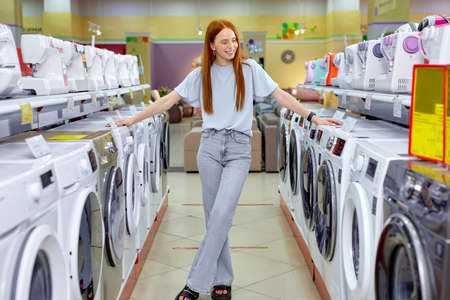Adorable lady in casual outfit stand by new washing machines, make purchase, new wash appliance. Caucasian lady with long red hair make choice, need help. shopping, consumerism concept