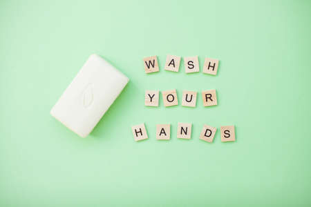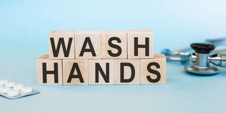 Concept image a word - WASH HANDS written on wood block on blue background with stethoscope and tablets