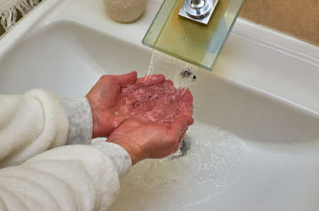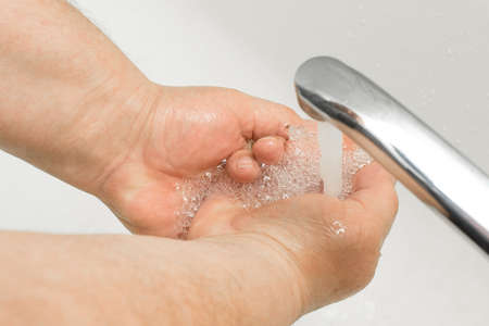 Elderly man washes her hands under the tap in the bathroom, recommendation for frequent handwashing, domestic hygiene.