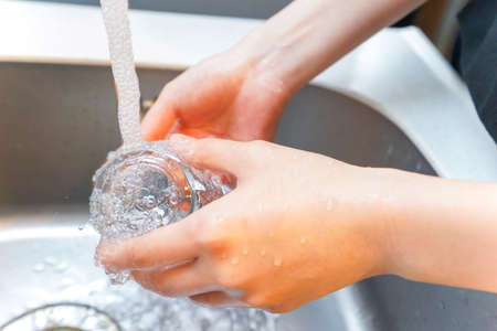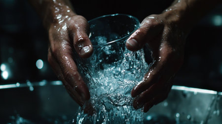 A detailed view of hands rinsing a glass under running water, highlighting the cleanliness and precision of dishwashing. . --ar 16:9 --v 6.1 Job ID: 6bd9ea0c-8840-409e-a97b-8e88de7b908f