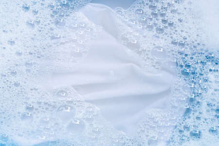 Protective medical mask soak in powder detergent water dissolution before washing. Hygiene coronavirus (Covid-19) protection concept. Top view