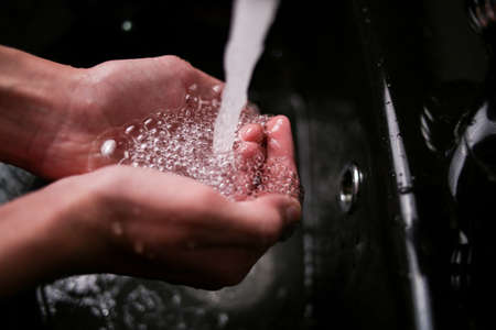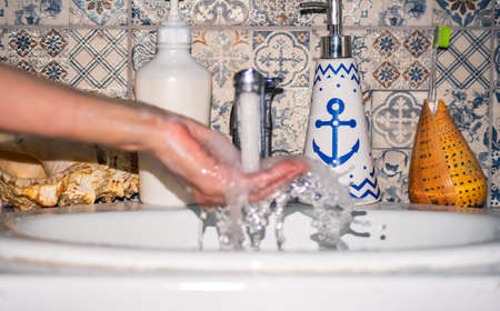 Close up details of woman washing hands at home . Hygiene and body cleaning concept detail