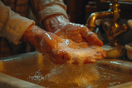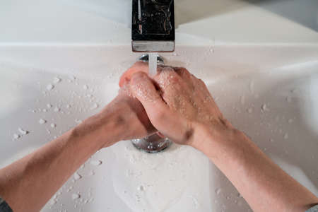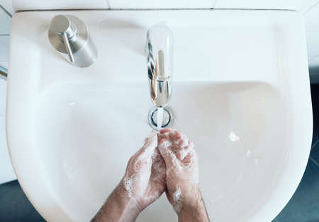 top view of person thoroughly washing hands at bathroom sink with soap and hot water