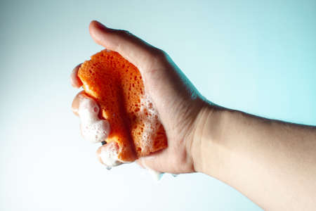 man’s hand squeezes a sponge for washing with water, washing with it and drops fall down concept on a light background copy space close up