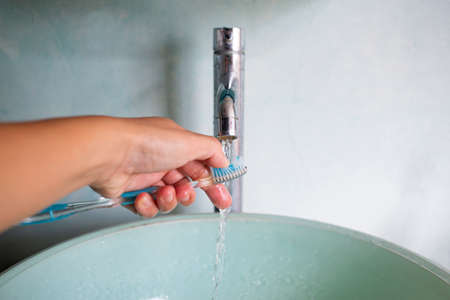 Woman's left hand washing toothbrush on green washbasin, Water flowing from faucet, Bathrooom concept