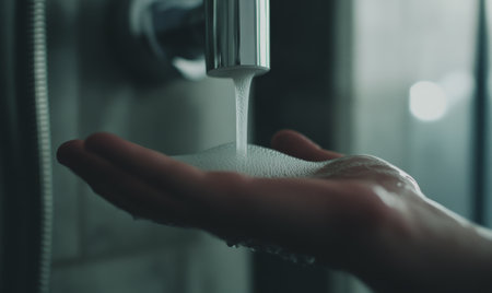 Close-up of a hand under running water, highlighting cleanliness and refreshing flow in a bathroom setting