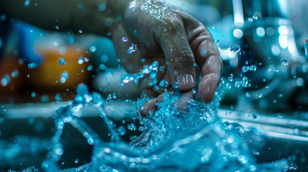 Close-up of a hand splashing water, creating dynamic blue droplets and bubbles. Refreshing and energetic scene capturing movement and freshness.