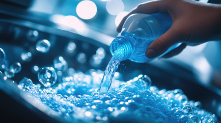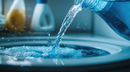 A close-up view of a liquid detergent being poured into a washing machine. Bubbles form as the blue liquid mixes with water, creating a fresh and clean laundry environment.