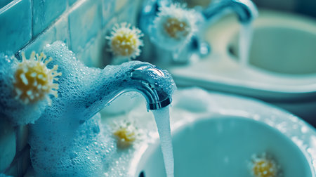 A close-up of a faucet with soap bubbles and decorative elements in a serene bathroom setting, showcasing cleanliness and tranquility.