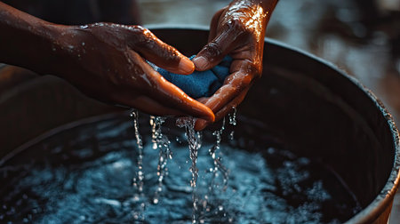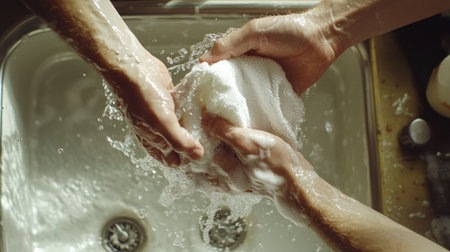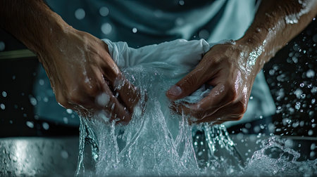 A close-up view of hands washing clothes in a basin, showcasing the action of wringing fabric. Water splashes create dynamic movement, emphasizing the effort in maintaining cleanliness.