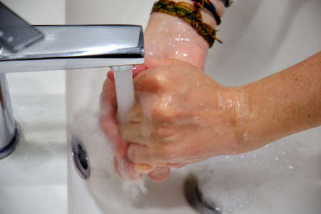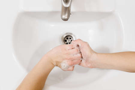 Washing hands with soap and hot water at home bathroom sink women cleansing hand hygiene for coronavirus outbreak prevention. Corona Virus pandemic protection by washing hands frequently.