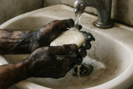 Dirty hands, stained with coal or grime, washing with soap and water under a faucet over a white sink. Hard work concept