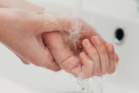 Coronavirus pandemic prevention. Washing hands with soap and warm water. Rubbing nails and fingers. Woman washing hand under running water.