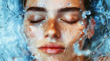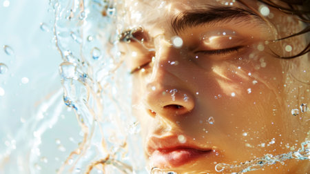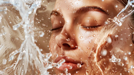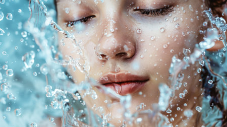 Close-up of white woman with closed eyes surrounded by splashing water, serene and refreshing ambiance