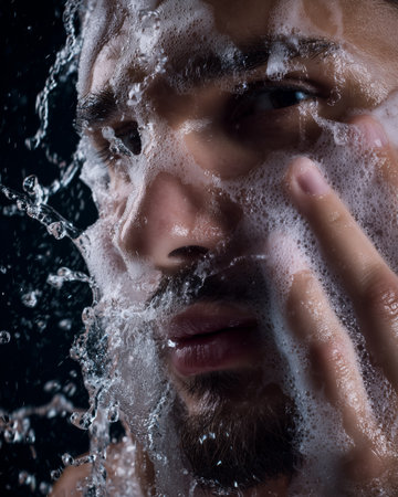 Young man with beard and mustache washing his face with cleansing foam and water. Facial skincare.