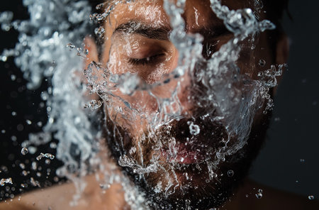 Macro shot of a mans face with eyes closed, as water splashes around him, capturing the intricate patterns and droplets in motion