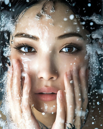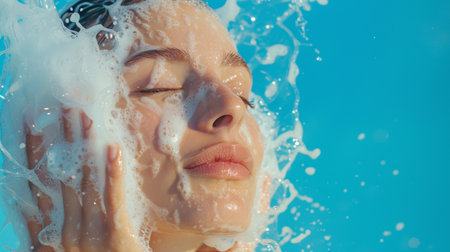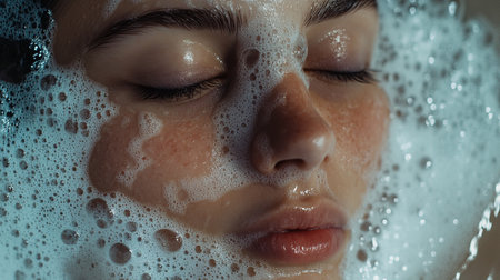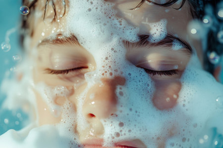 This close-up image captures the serene expression of a person with soapy bubbles on their face, highlighting freshness and relaxation.