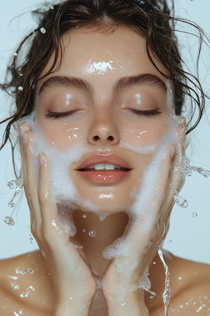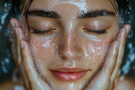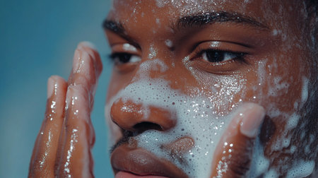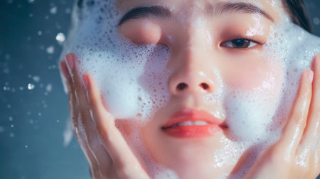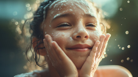 Close-up of a teenager enjoying their morning routine by washing their face with foaming cleanser, resulting in playful bubbles and a refreshed expression.