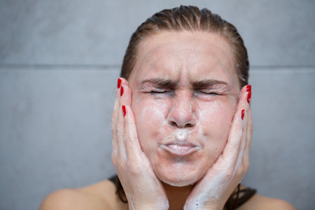 Close up of a young woman applying cleansing foam on her face, highlighting the concept of skincare and beauty routine