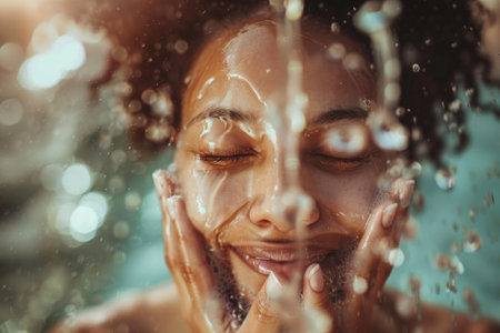 Woman smiling while washing her face with water splashing in a refreshing, bright setting