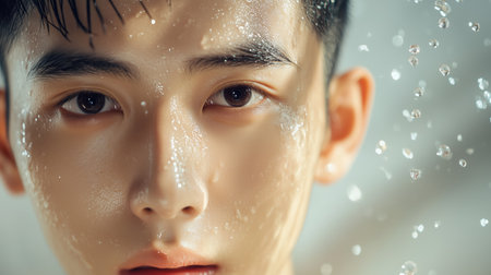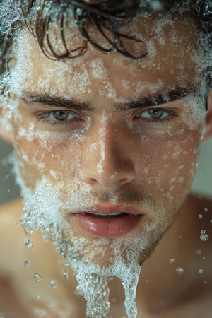 Young man with wet skin experiencing water droplets on his face in a serene setting captured during soft lighting